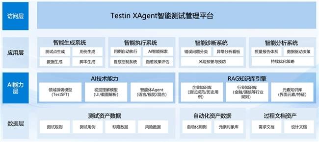 Testin云测的实践揭示了一个重要规律:智能化测试的进阶不是技术叠加,而是能力的系统性跃迁。在技术架构层面,其构建了完整的AI工程体系:数据层整合测试资产、AI能力层包含领域微调模型和多类Agent、应用层实现智能生成/执行/诊断/分析、访问层统一呈现。这个四层架构确保了AI能力的系统性和持续进化,如图4所示。