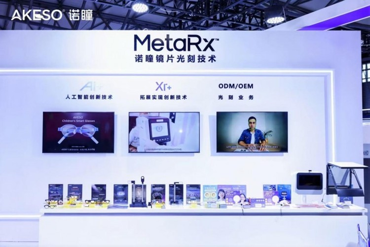 走进诺瞳奕目展区,最引人注目的莫过于MetaRx镜片光刻技术的全维度展示。作为一家深耕眼视光领域的创新科技企业,诺瞳奕目致力于通过半导体光刻技术的突破来解决行业痛点。传统的镜片制造工艺在应对复杂光学设计时常面临精度和效率的平衡难题,诺瞳奕目依托自有研发团队在创新光学设计、材料学及人工智能领域的深厚积淀,将半导体领域的高精密光刻工艺跨界应用于眼视光领域。这种技术革新不仅提升了镜片表面的微结构精度,更让定制化、高参数的视觉矫正方案大规模量产成为可能。展位现场通过多媒体交互和实物对比,清晰勾勒出光刻技术如何赋能生产制造,实现从实验室研发到临床应用的高效转化。