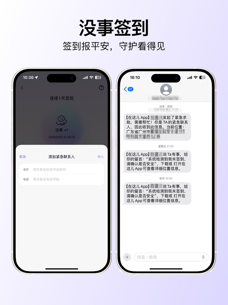尤为重要的是,此次新增的“每日没事签到”功能,并非独立模块,而是与“在这儿APP”已成熟的安全体系深度联动、高效融合,进一步完善了 “签到提醒 — 异常预警 — 应急处置” 的闭环守护模式。当断签预警触发后,紧急联系人可通过平台原有的实时定位、轨迹回放、SOS紧急求助等功能快速响应,实现 “一处预警、多端联动”,打破空间距离对家庭守护的限制,让远方的牵挂真正落地。这一功能的加入,也精准填补了家庭日常平安报备领域的场景空白。
