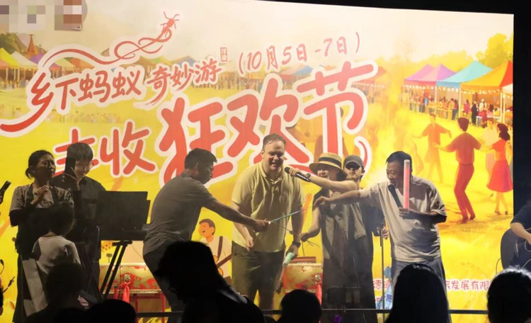 打卡赠礼环节,参与者奔赴打卡点拍照。来自景德镇市区的游客带着孩子在“不服来掷区”玩耍:“今天我们带着小孩子,来到乡下蚂蚁乐园玩,晚上还有烟花秀,还能吃这边的长桌宴,我们一家都非常开心!”来自希腊的游客伊卢告诉笔者:“这是我第二次来到中国,我喜欢这里的环境,它给了我很多能量。此外,我与当地人的关系也非常好,他们非常乐于助人,我非常喜欢他们!”