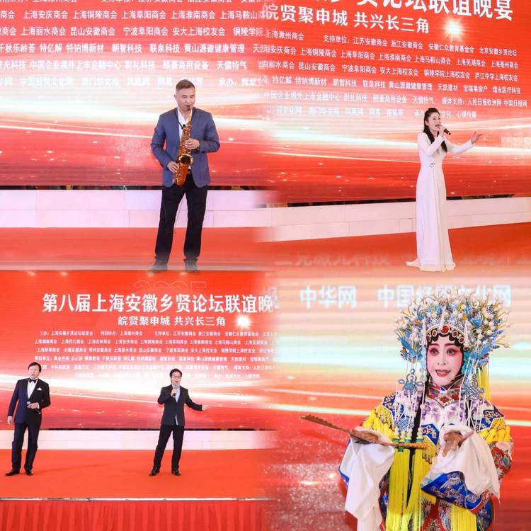 随后,艺术之音悠然响起。男高音歌唱家、上海财经大学人文学院艺术中心副教授徐润涛深情献唱《重归苏莲托》《在那遥远的地方》,歌声高亢悠扬,如江流婉转,牵动游子心弦。他更与上海歌剧院国家一级演员、男低音歌唱家徐琦联袂演绎经典名曲《我的太阳》,一高一低、交相辉映,激荡人心,赢得经久不息的掌声。女高音歌唱家、上海建桥学院副教授赵师娲登台献唱《珊瑚颂》《欢天喜地》,嗓音清亮婉转,饱含深情与喜悦,唤起在场嘉宾对家乡风物与童年记忆的无限眷恋。民乐与器乐演奏同样精彩纷呈。笛子独奏《催马扬鞭运粮忙》节奏明快、气势豪迈,仿佛再现江淮大地丰收奔腾的景象;今森实业董事长董全以萨克斯深情演绎《秋恋》《搀扶》,旋律婉转低回,诉说游子思乡之情;上海大学艺术学院讲师吴非的笛子独奏《红梅赞》,更以一曲红梅傲雪,致敬家国情怀与坚韧品格。韵味醇厚的京剧选段《贵妃醉酒》由国家一级演员周燕萍倾情演绎,唱腔华美、身段典雅,将中国传统戏曲之美展现得淋漓尽致,赢得满堂喝彩。华彩落幕,情意未央。乡贤们在欢笑与感动中举杯共庆,共期未来携手反哺桑梓、共兴江淮的美好图景。
