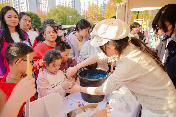 从杭州下沙江滨花园未来社区、春园村党群服务中心社区居民,到听涛小学学生,沿江大道听潮颂玥南林地游客,再到湖州安吉鄣吴镇昌硕故居居民……团队走出校门,面向社会大众群体,开展帆布包扎染、中药香囊制作、漆扇绘制、京剧脸谱创作等丰富体验活动。在活动中,学生志愿者一对一指导参与者动手创作,同步讲解技艺背后的文化内涵,每场活动结束后还设置作品展示、互动评比等环节,增强参与感与成就感。